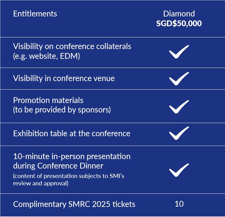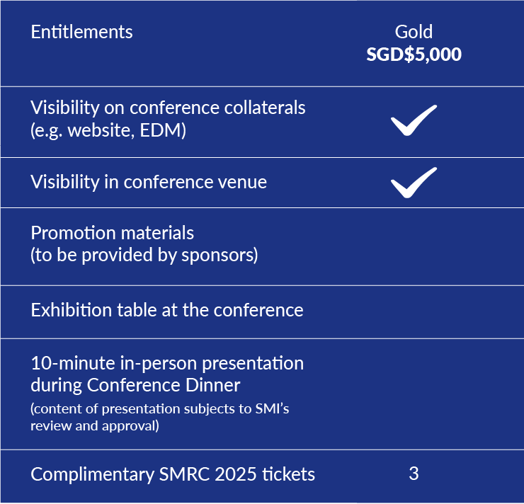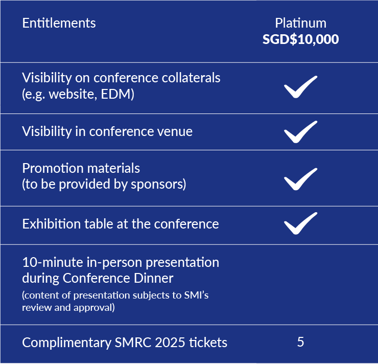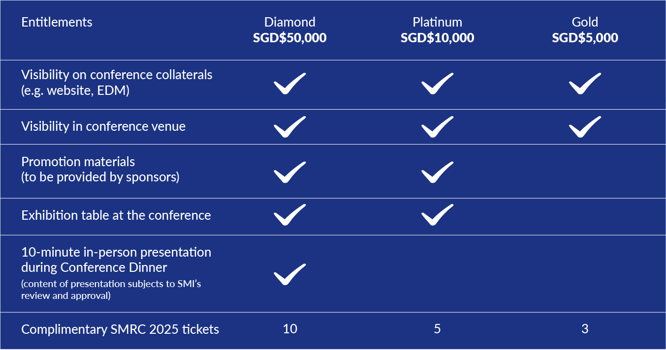 Singapore Maritime Research Conference offers diverse marketing platforms for organisations to showcase their brand to a targeted audience of industry and government leaders as well as local and international research community and government. Sponsorship entitlements for the various categories are as follows: